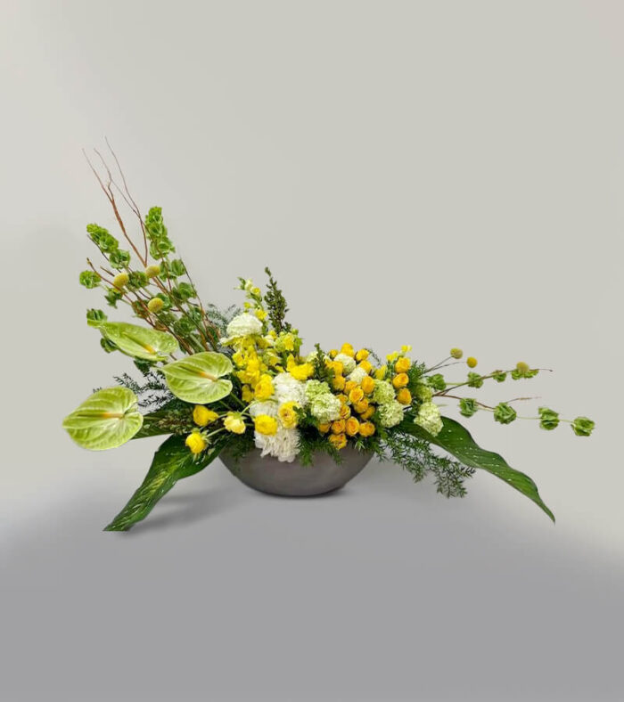 Bold and sophisticated arrangement featuring yellow and lush green Flowers, artfully arranged in a tall, elegant vase. With their glossy, heart-shaped blooms and exotic presence, anthuriums are the epitome of modern tropical luxury.