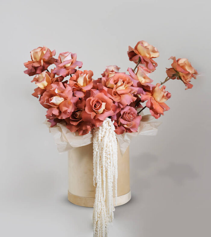 Blushing Horizon is a breathtaking rose basket inspired by the gentle beauty of a sunrise. Featuring a radiant blend of peach, soft orange, warm pink, and golden yellow roses, this arrangement captures the magic of early morning light. Each bloom is thoughtfully arranged in a charming basket, creating a warm and uplifting palette that symbolizes new beginnings, hope, and joy. Blushing Horizon is a perfect gift to brighten someone’s day, celebrate fresh starts, or simply share a moment of natural beauty and heartfelt emotion.