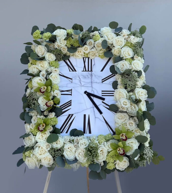Our Clock-Shaped Standing Tribute is a beautiful and symbolic floral arrangement created to honor a loved one whose time on earth left a lasting impression. Designed in the shape of a classic round clock and displayed on a standing easel, this tribute represents the passage of time, cherished moments, and a life well-lived.Expertly handcrafted with fresh, high-quality blooms, this meaningful design incorporates thoughtful floral placement to mimic clock hands and numerals, offering a touching reminder that every moment shared was precious.