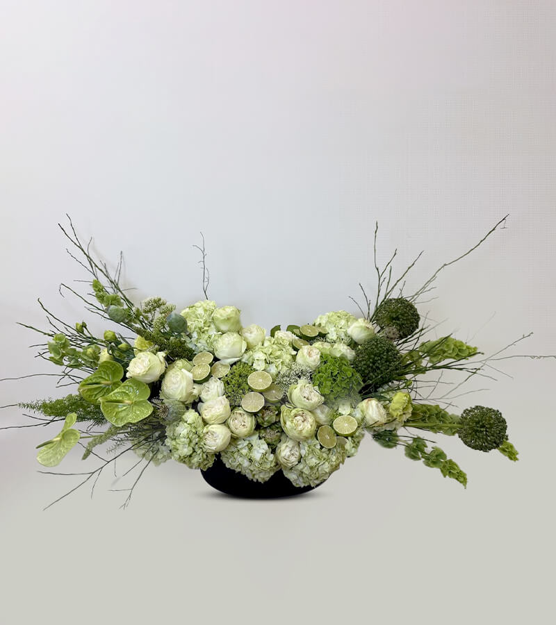 Lime Luxe is a sleek and contemporary floral statement that radiates freshness, sophistication, and bold style. This arrangement features a curated blend of:Elegant green roses, symbolizing harmony and renewal.Glossy green anthuriums, known for their sculptural beauty and exotic charm Fresh lime accents, adding a zesty, vibrant twist that enhances the natural green palette.Presented in a tall, modern vase, this design brings a clean and luxurious feel to any space