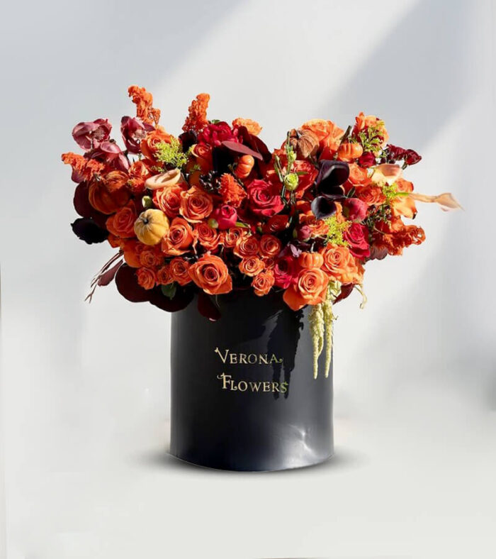 This luxurious black box arrangement features a stunning mix of vibrant orange roses, deep burgundy calla lilies, and elegant cymbidium orchids, creating a striking contrast of colors.