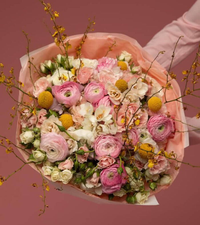 Phantom’s Garden is a floral arrangement that feels like a fleeting dream—mysterious, enchanting, and elegantly untamed. Soft pink roses, symbolizing love and admiration, bloom at the heart of this piece, their delicate petals whispering secrets of romance and nostalgia. Accents of golden-yellow accessories add warmth and intrigue, like the last rays of sunlight filtering through an enchanted forest.