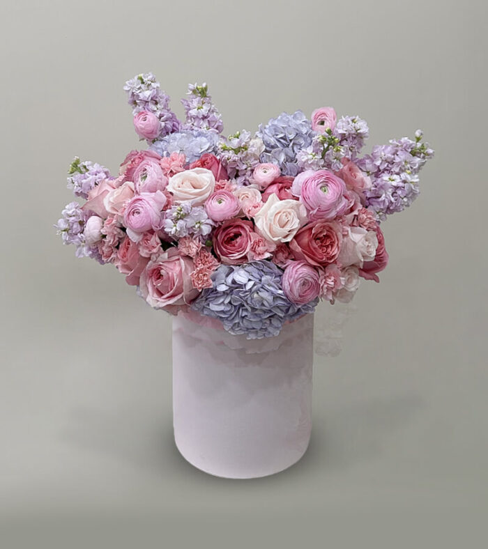 A luxurious floral arrangement featuring classic roses, voluminous hydrangeas, and delicate ranunculus blooms.