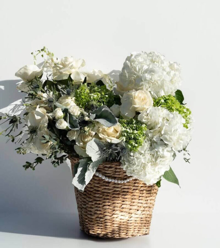 This enchanting basket features delicate white roses, lush green and white hydrangeas, and the soft, silvery touch of dusty miller, creating a serene and timeless composition. The gentle hues and textured greenery combine to form a tranquil and elegant centerpiece, perfect for any occasion.