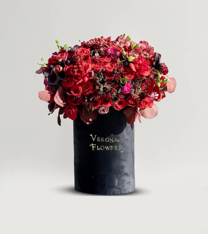 This striking black box arrangement showcases bold red roses, luxurious red peonies, and deep burgundy calla lilies, creating a rich and passionate blend of colors. The elegant contrast of vibrant reds and burgundy, paired with the modern black box, exudes sophistication and romance, making it the perfect gift for any special occasion.