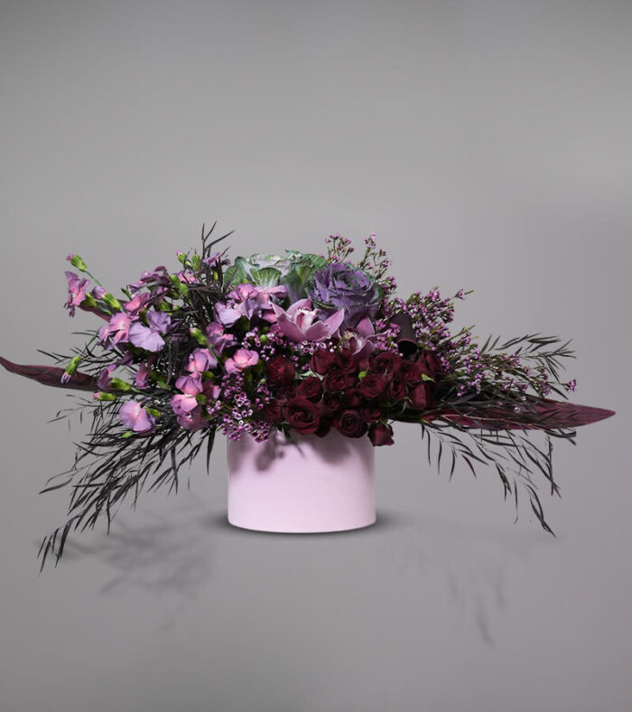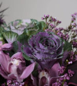 This luxurious arrangement showcases a harmonious blend of purple blooms elegantly set in a matching purple box. The tone-on-tone color scheme creates a regal and romantic look, ideal for conveying admiration, creativity, and elegance.